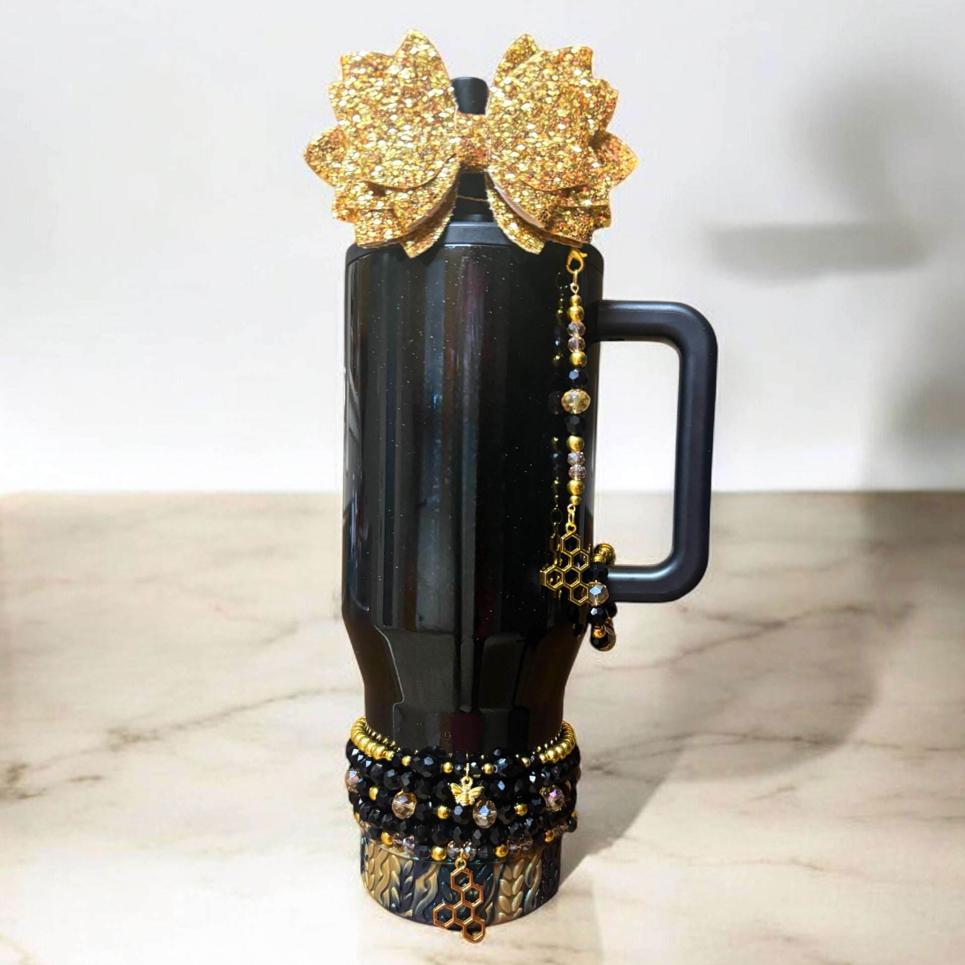 *Straw Dangle has acrylic attachment that slides down over straw which stays down and in place with a straw topper bow over the top. Fits 10mm straw. Spout option has loop to loop around spout.