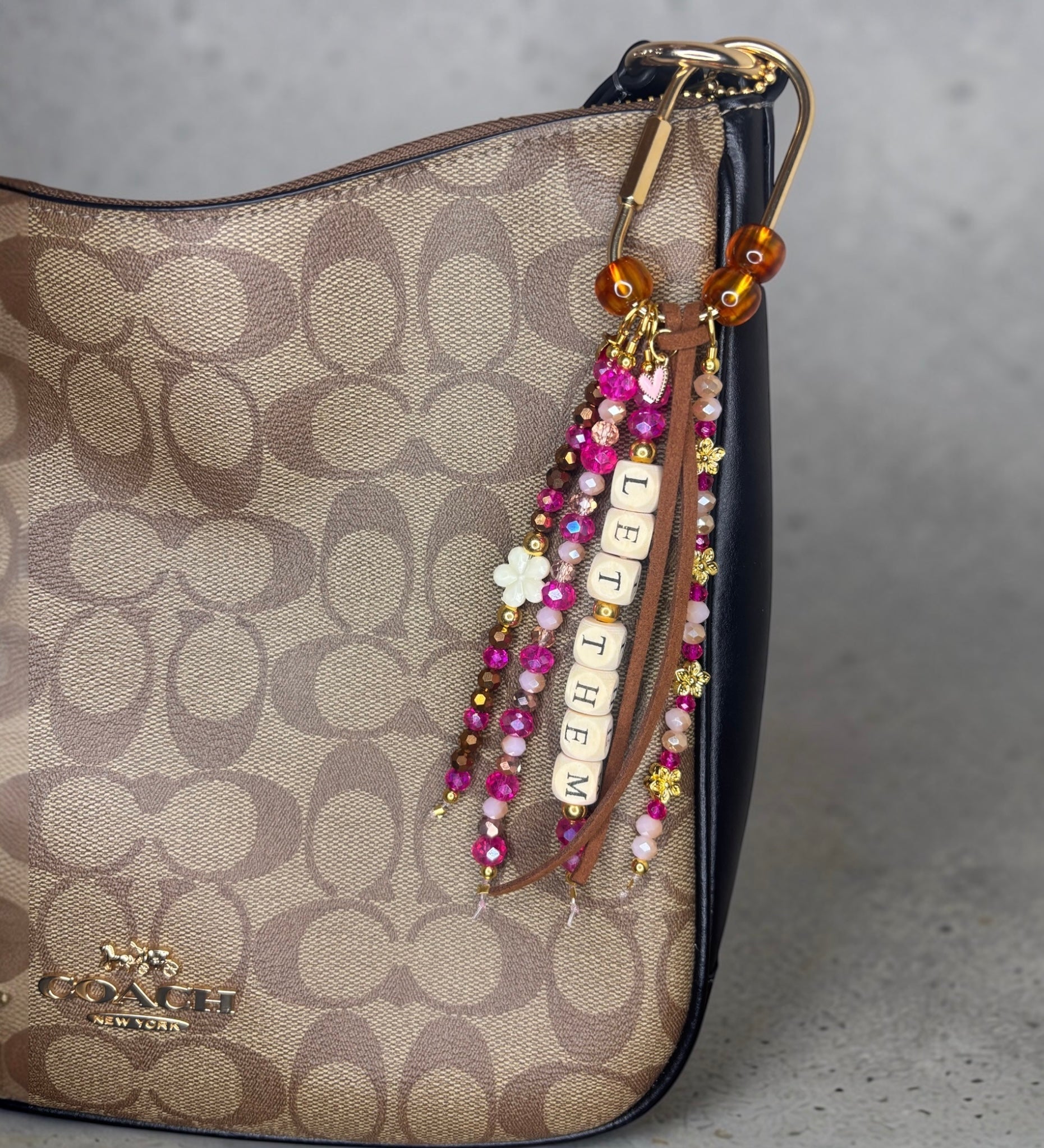 Charm is attached to a carabiner clip to easily add onto your bag or purse strap. Clip it anywhere. Pattern and beading placement may slighty vary.