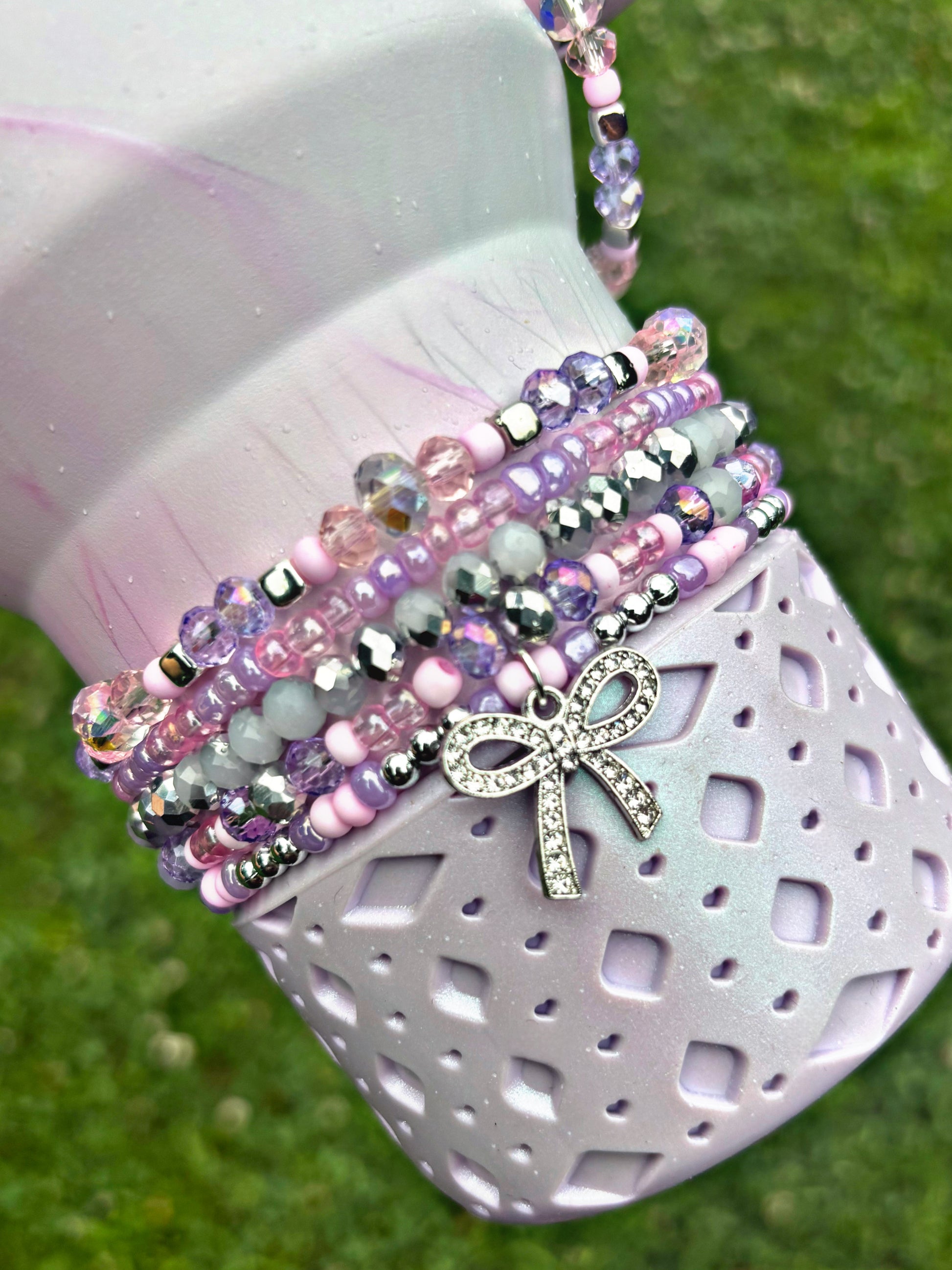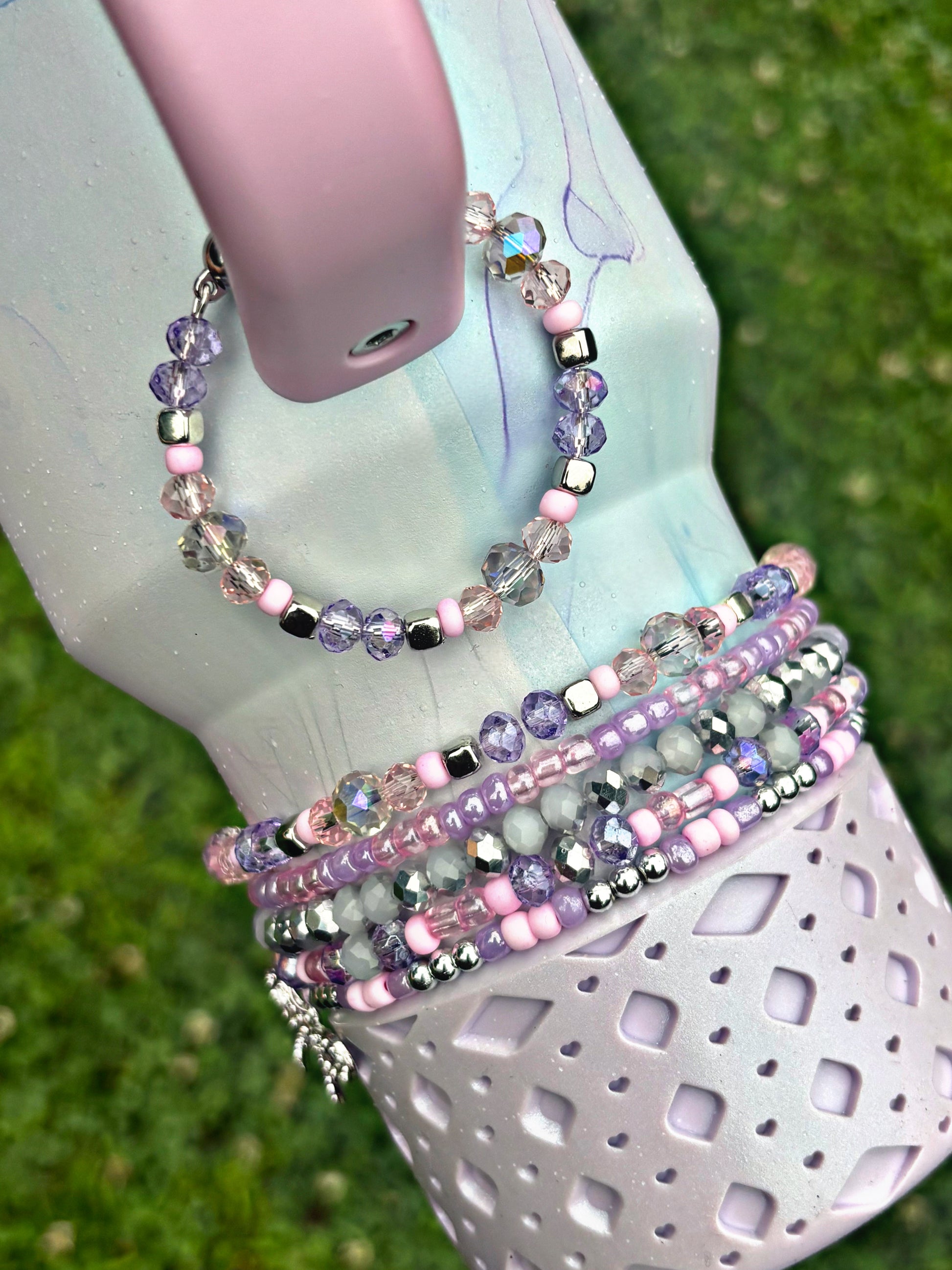 *Bottom bracelets comes with a stack of 3 OR 5 bracelets. Fits 24oz Owala, 30 & 40oz Stanely’s & 32 oz Hydrojug. Message me OR leave a note at checkout for other for any other sizing needs such as “42oz HJ”.