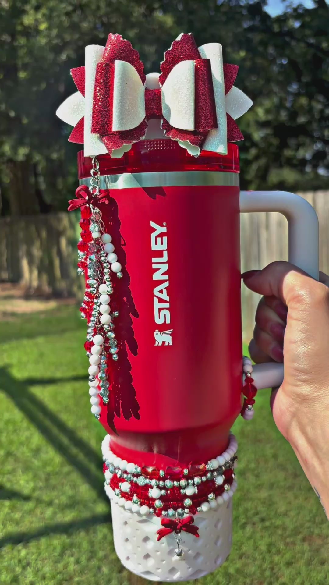 *Straw Dangle has acrylic attachment that slides down over straw which stays down and in place with a straw topper bow over the top. Fits 10mm straw. Spout option has loop to loop around spout.
