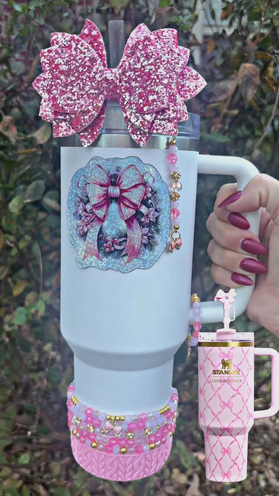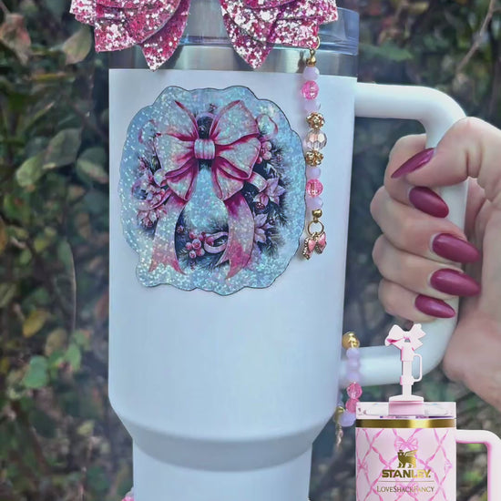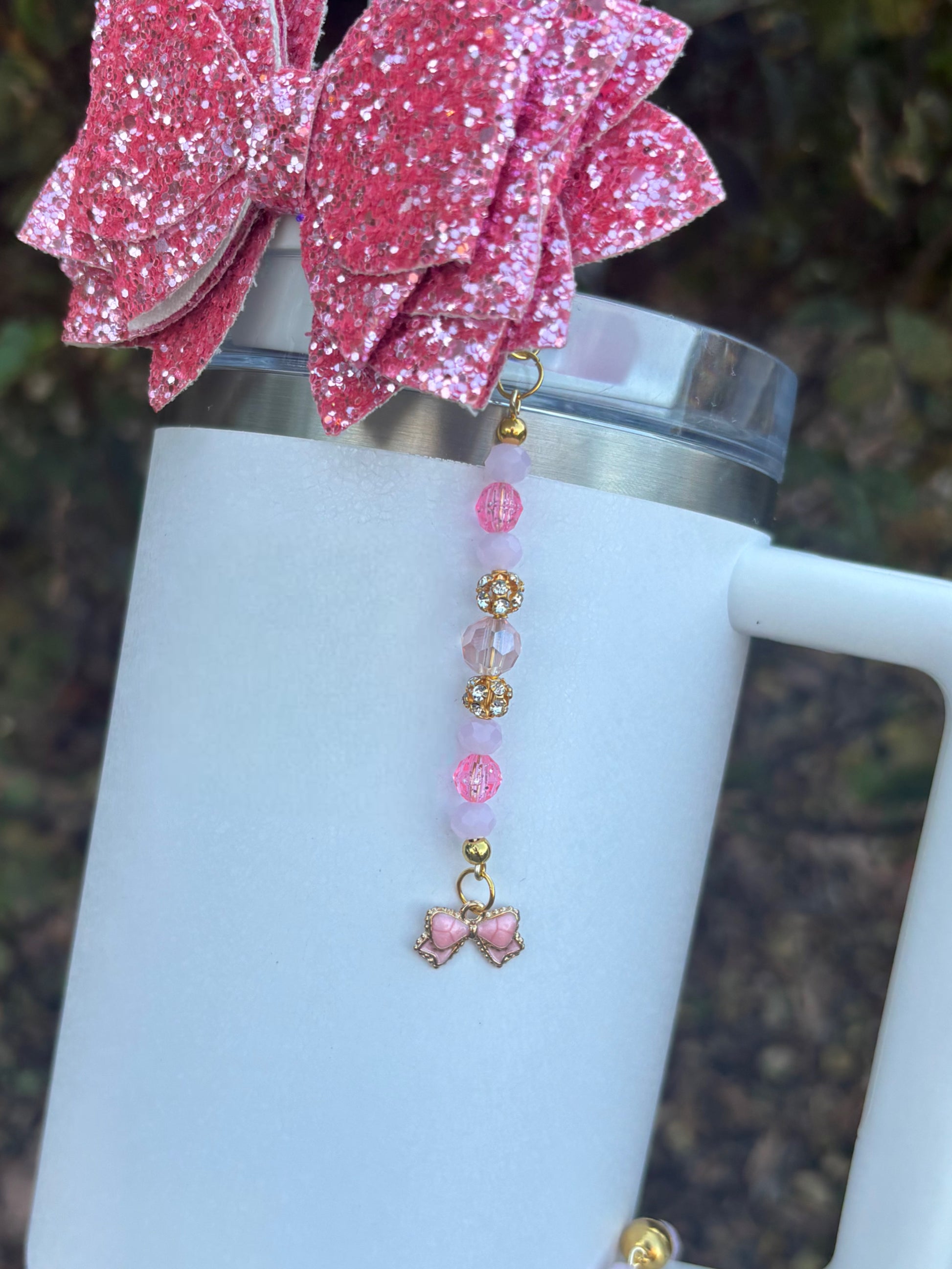 *Straw Dangle has acrylic attachment that slides down over straw which stays down and in place with a straw topper bow over the top. Fits 10mm straw. Spout option has loop to loop around spout.