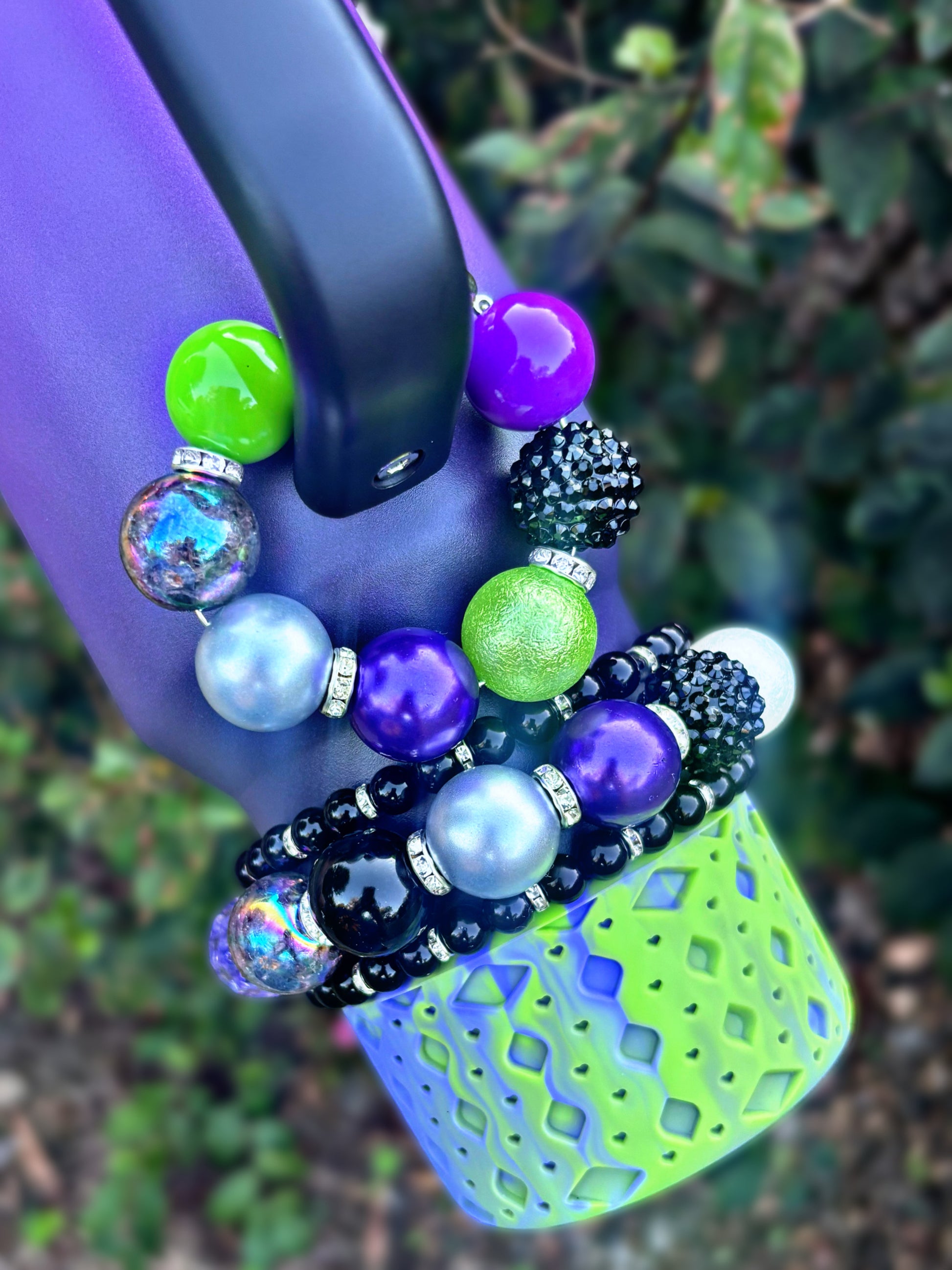 Can also go around some bag and purse handles. Made with flexible wire and magnetic closure for easy attaching and removing.