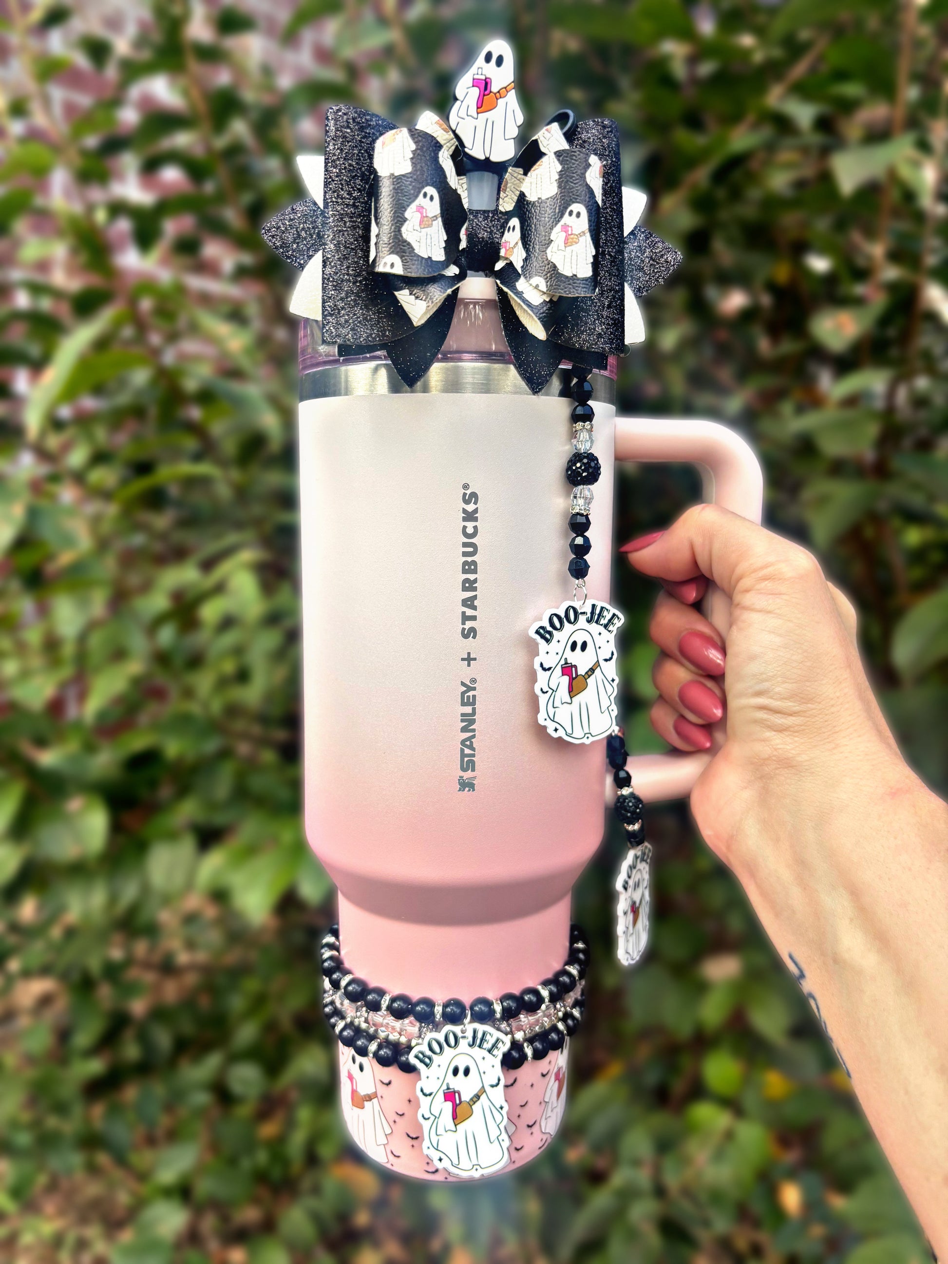 *Straw Dangle has acrylic attachment that slides down over straw which stays down and in place with a straw topper bow over the top. Fits 10mm straw. Spout option has loop to loop around spout.