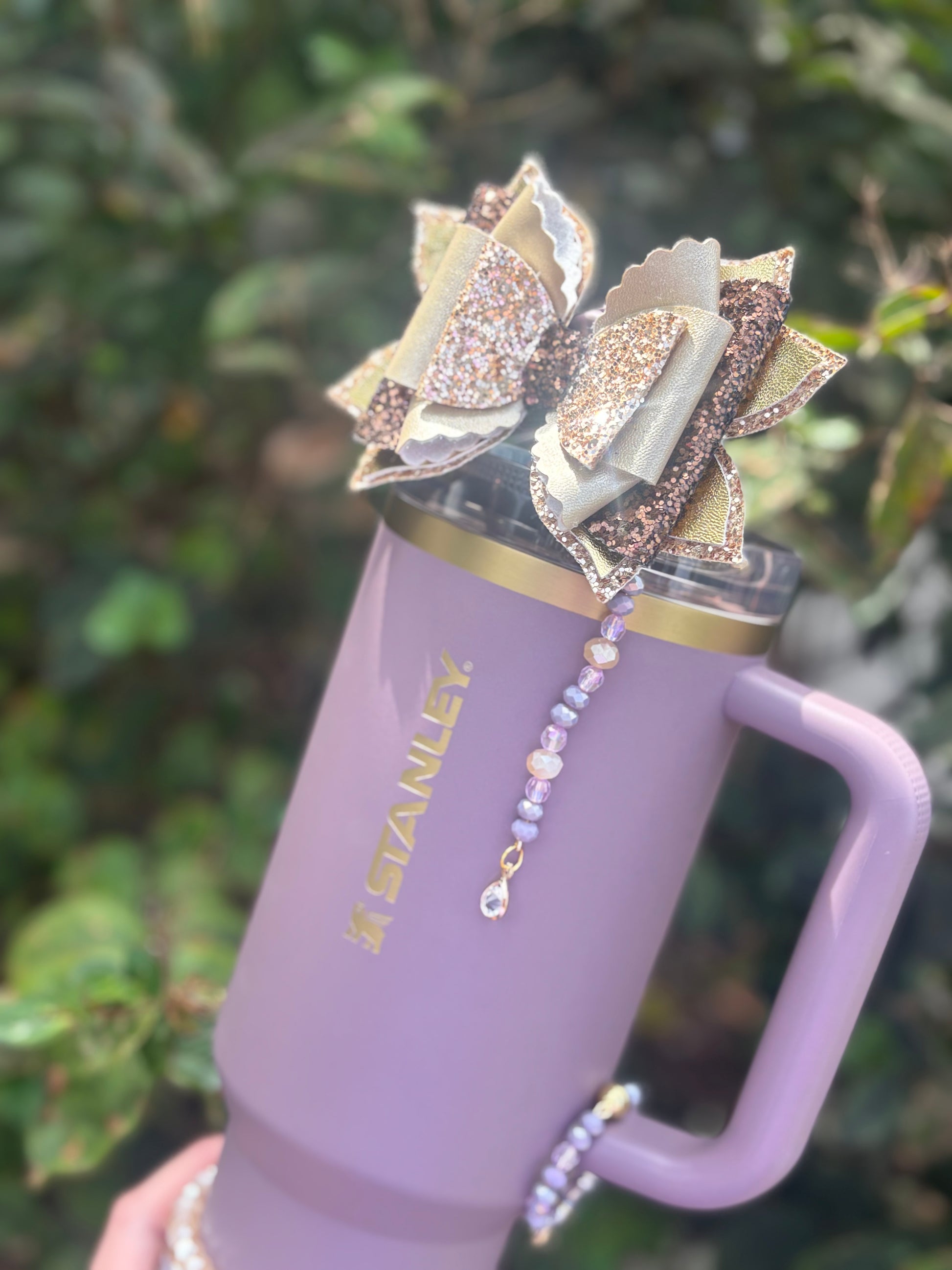 *Straw Dangle has acrylic attachment that slides down over straw which stays down and in place with a straw topper bow over the top. Fits 10mm straw. Spout option has loop to loop around spout.