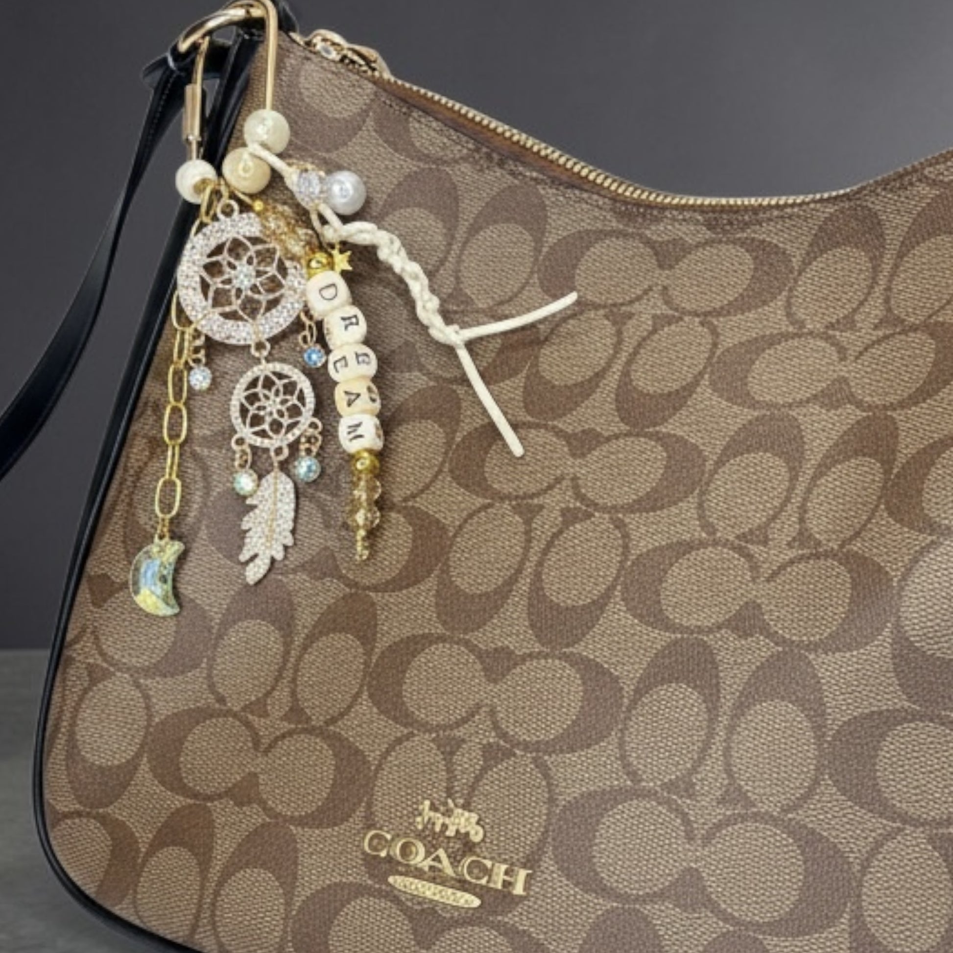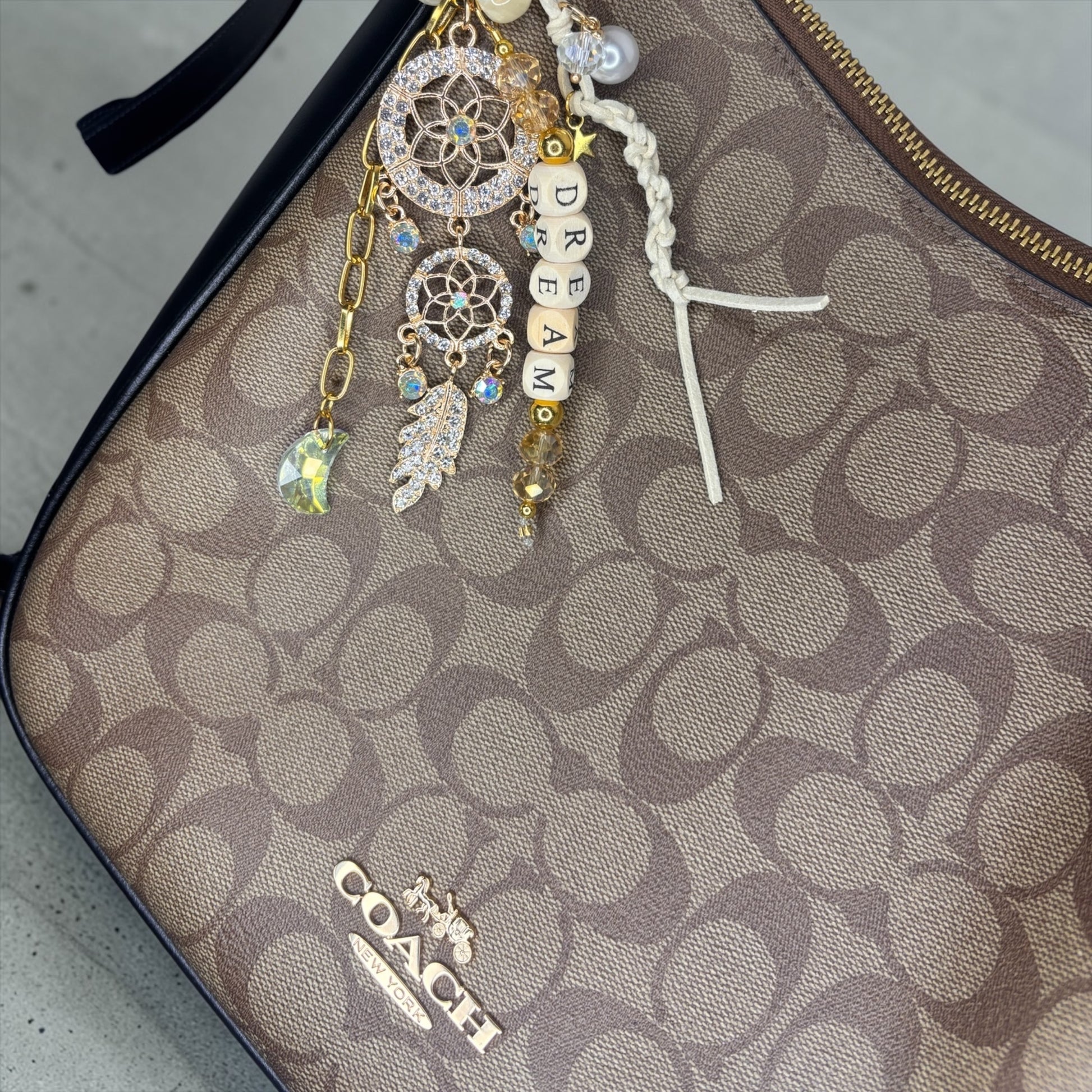 Charm is attached to a carabiner clip to easily add onto your bag or purse strap. Clip it anywhere. Pattern and beading placement may slighty vary.