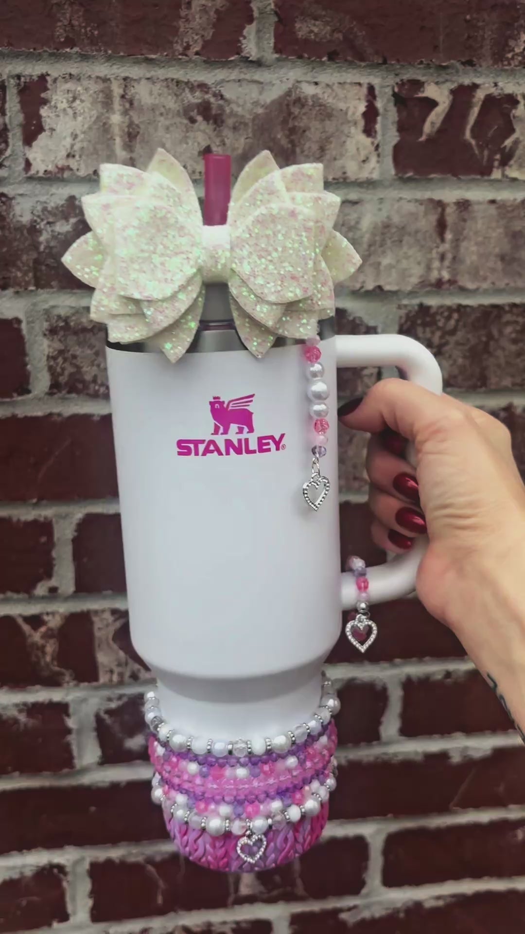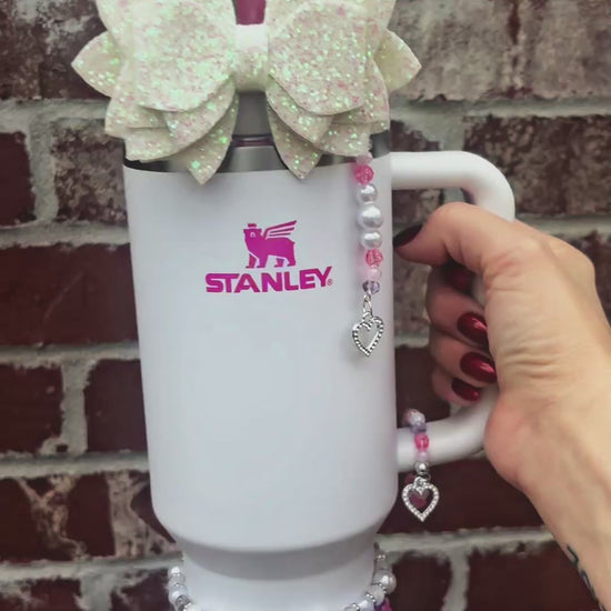 *Straw Dangle has acrylic attachment that slides down over straw which stays down and in place with a straw topper bow over the top. Fits 10mm straw. Spout option has loop to loop around spout.