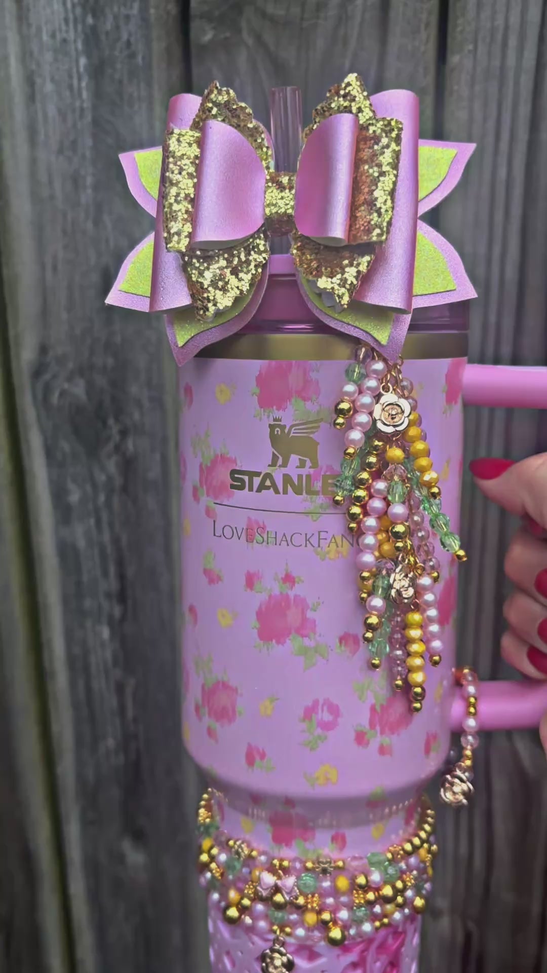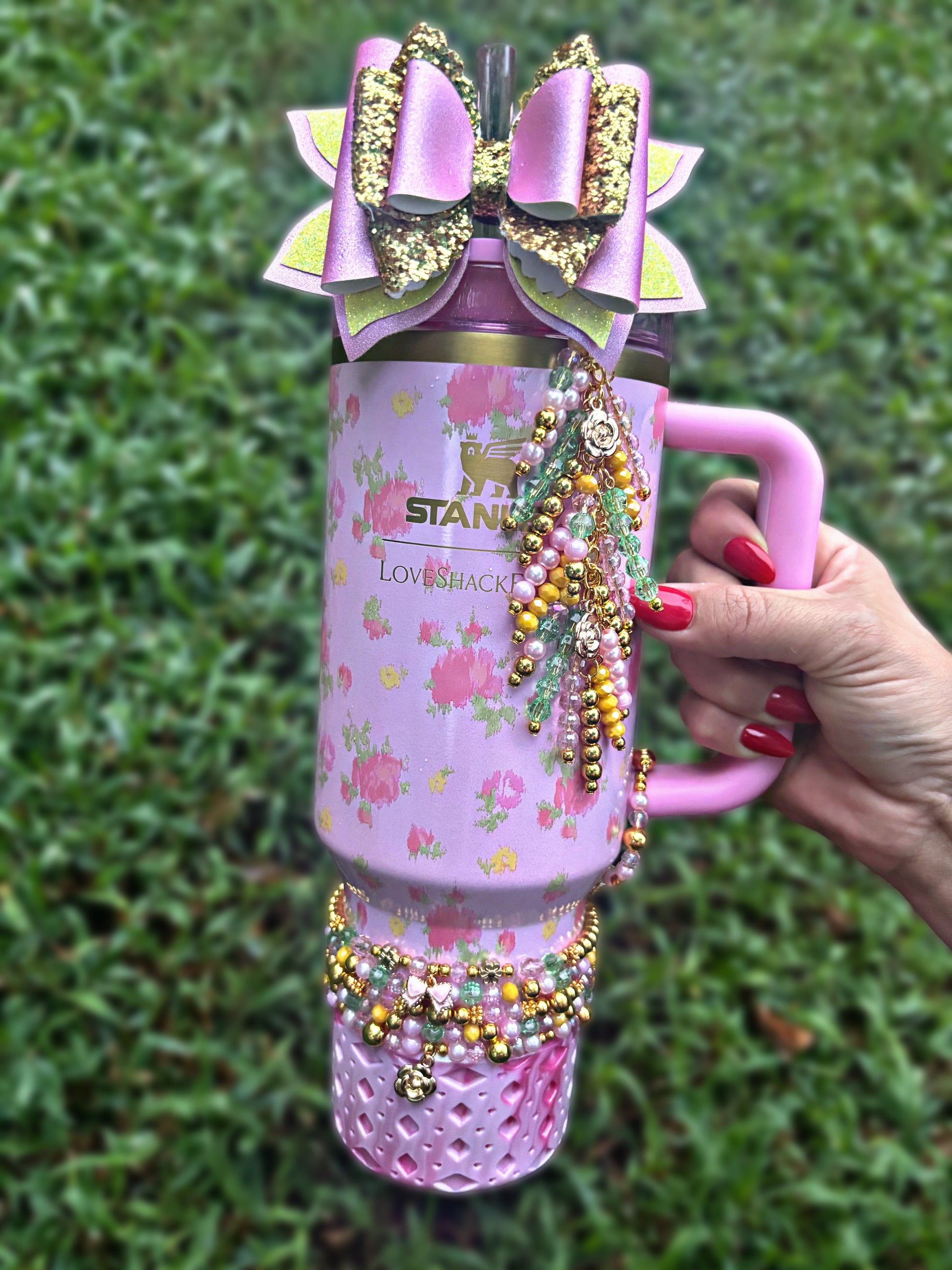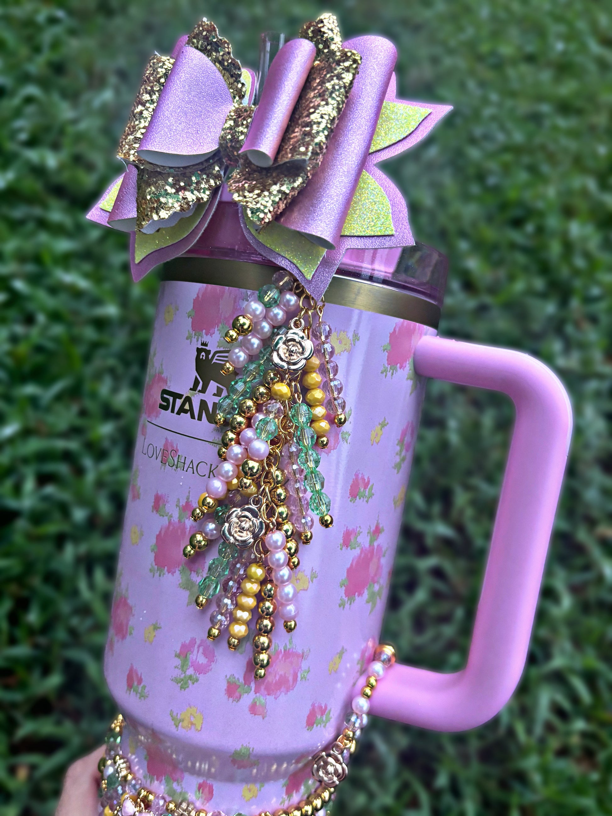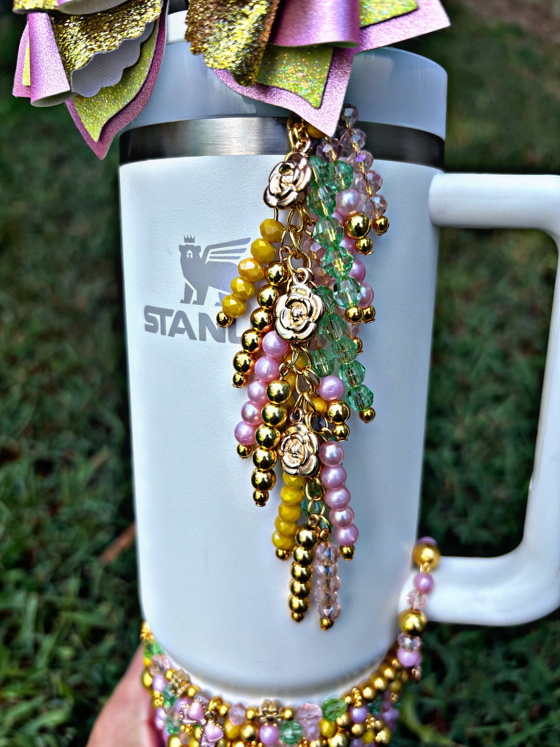 *Straw Dangle has acrylic attachment that slides down over straw which stays down and in place with a straw topper bow over the top. Fits 10mm straw. Spout option has loop to loop around spout.