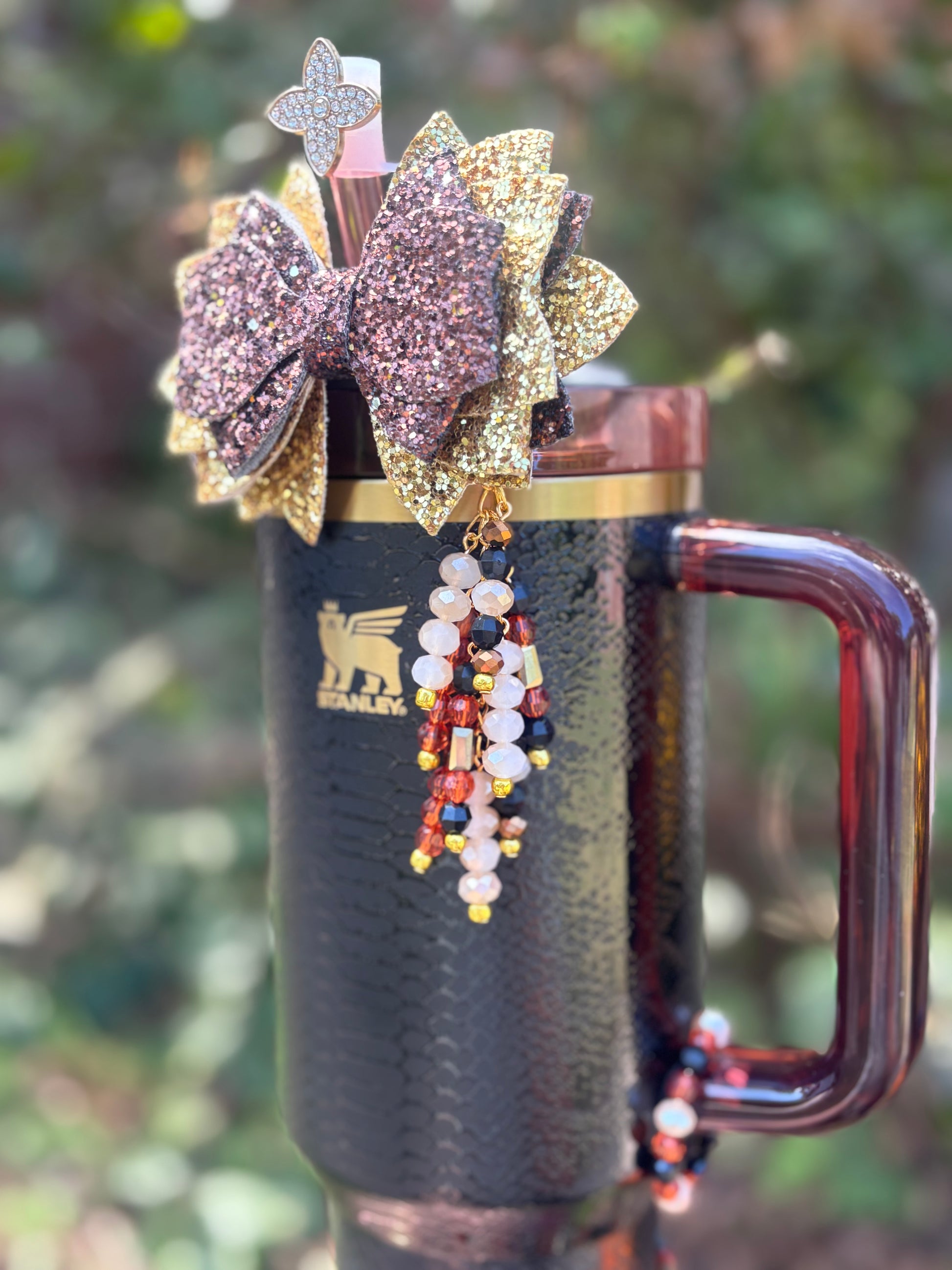 *Straw Dangle has acrylic attachment that slides down over straw which stays down and in place with a straw topper bow over the top. Fits 10mm straw. Spout option has loop to loop around spout.