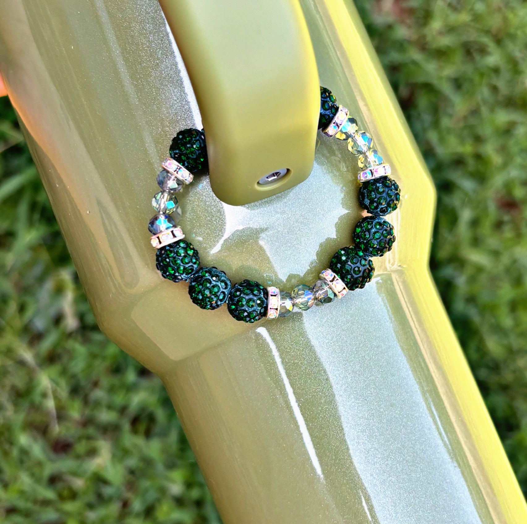 Can also go around some bag and purse handles. Made with flexible wire with hook and loop for easy attaching and removing.
