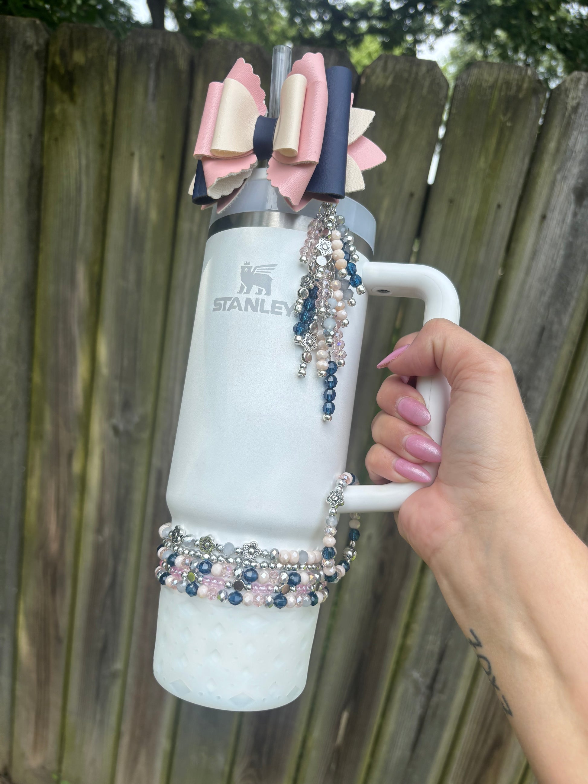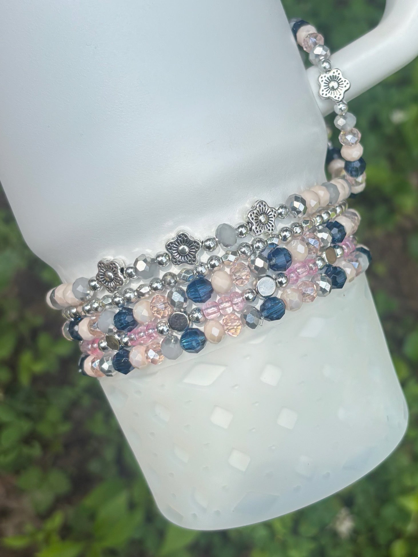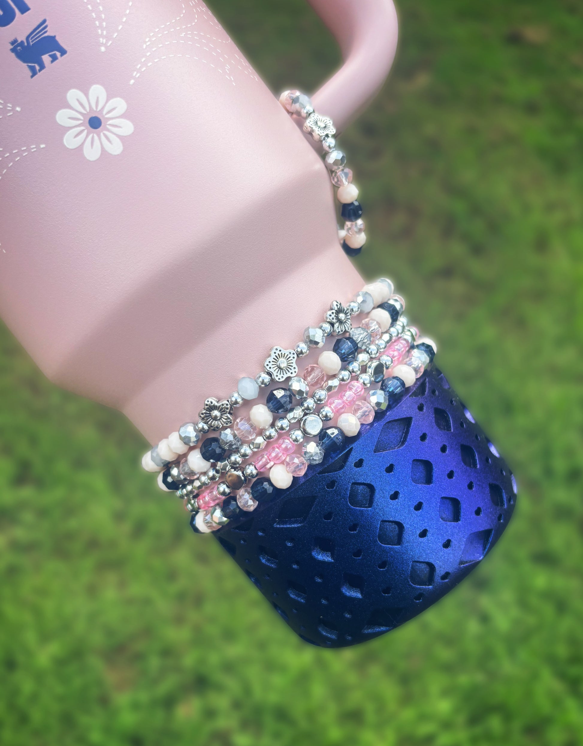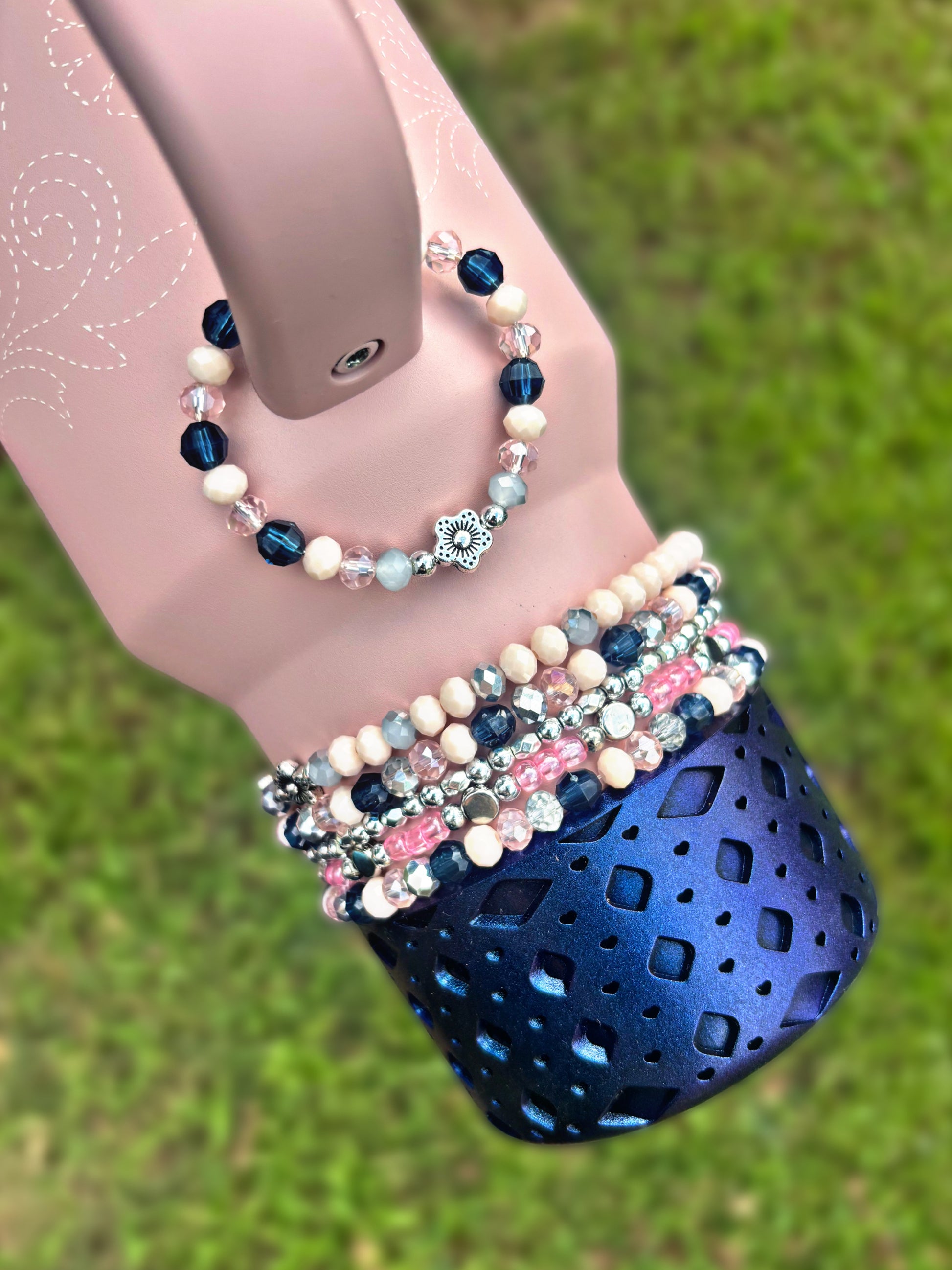 Bottom bracelets comes with a stack of 4 bracelets or 5. Fits 24oz Owala, 30 & 40oz Stanely’s & 32 oz Hydrojug. Message me OR leave a note at checkout for other for any other sizing needs such as “42oz HJ”.