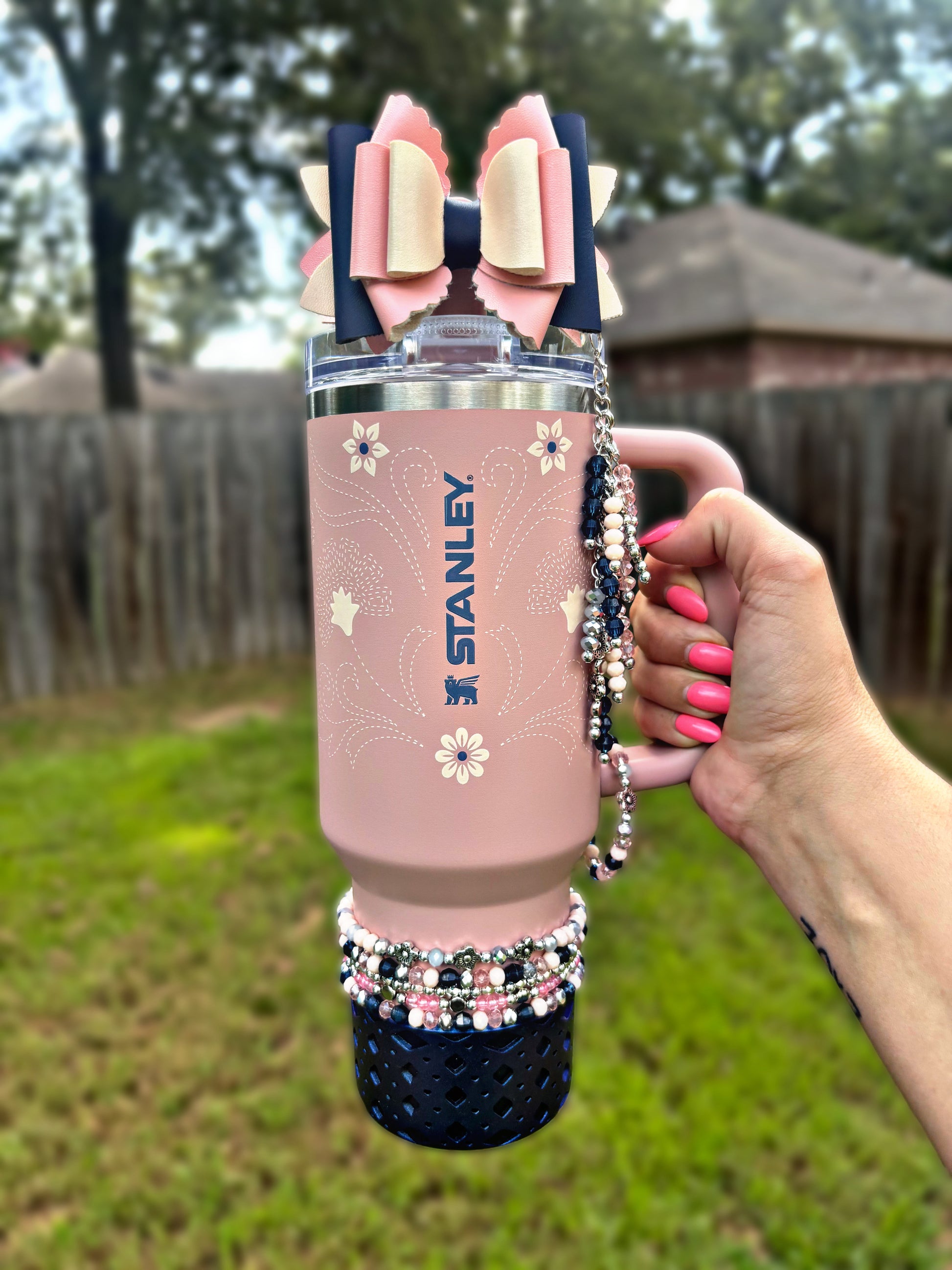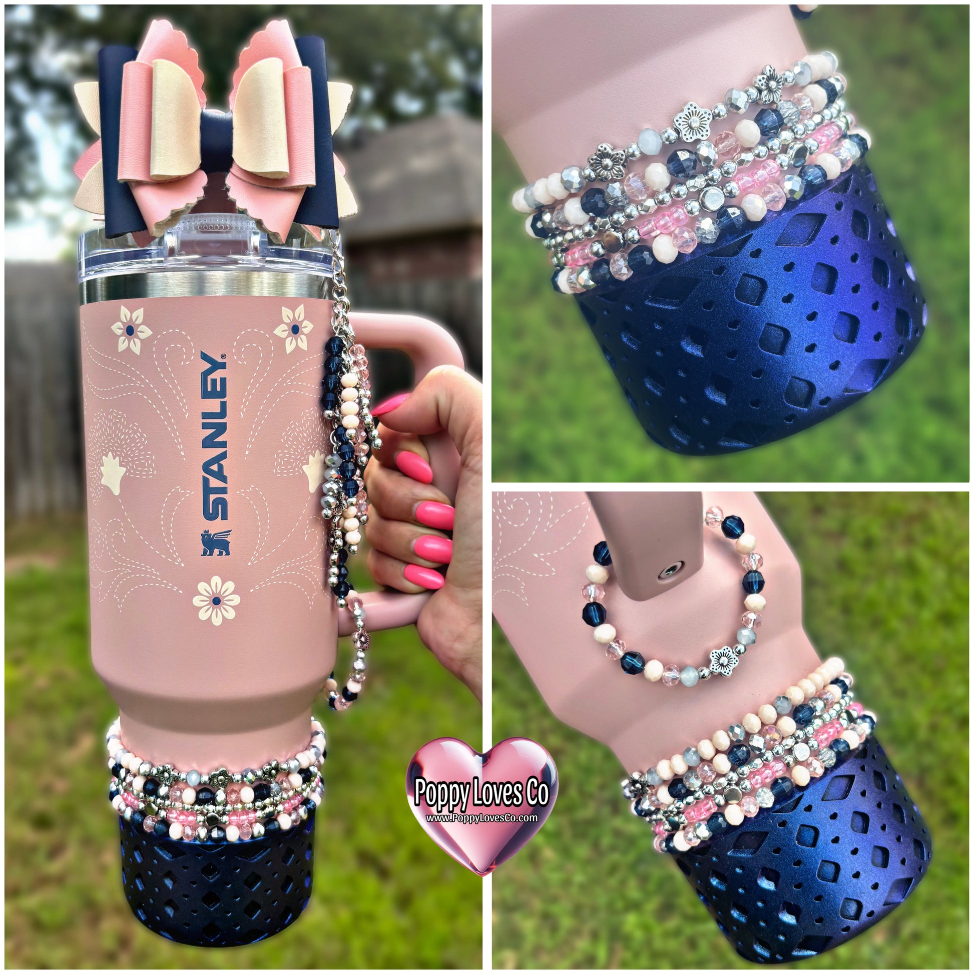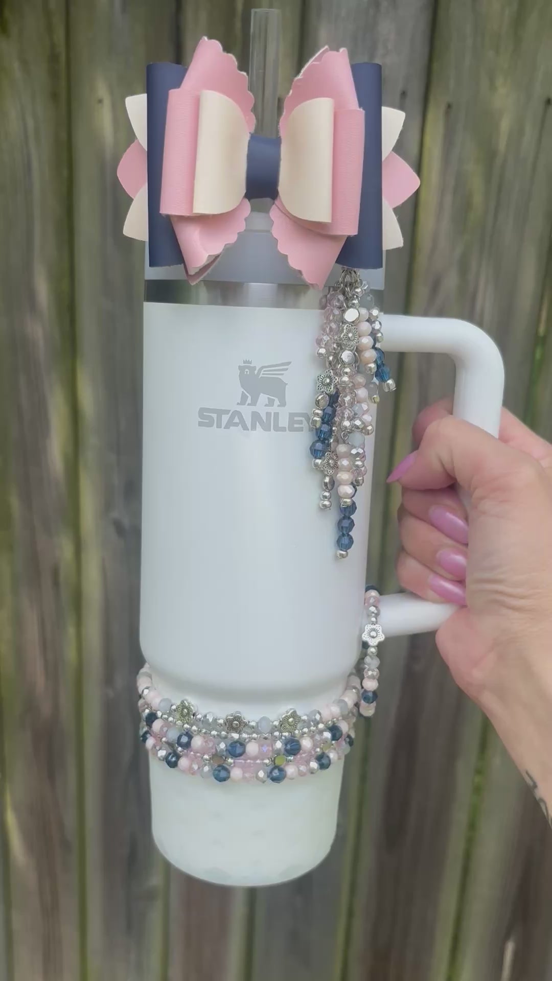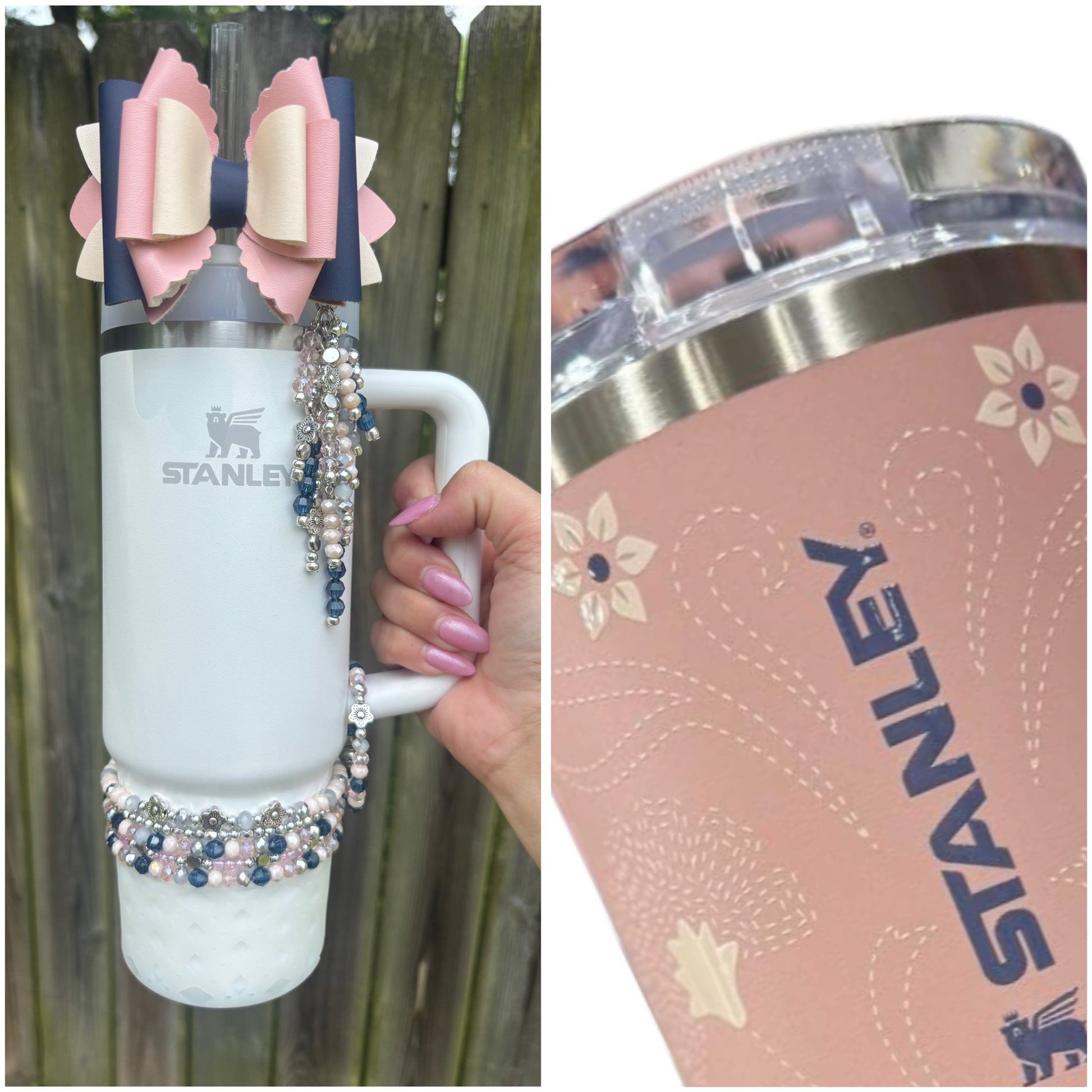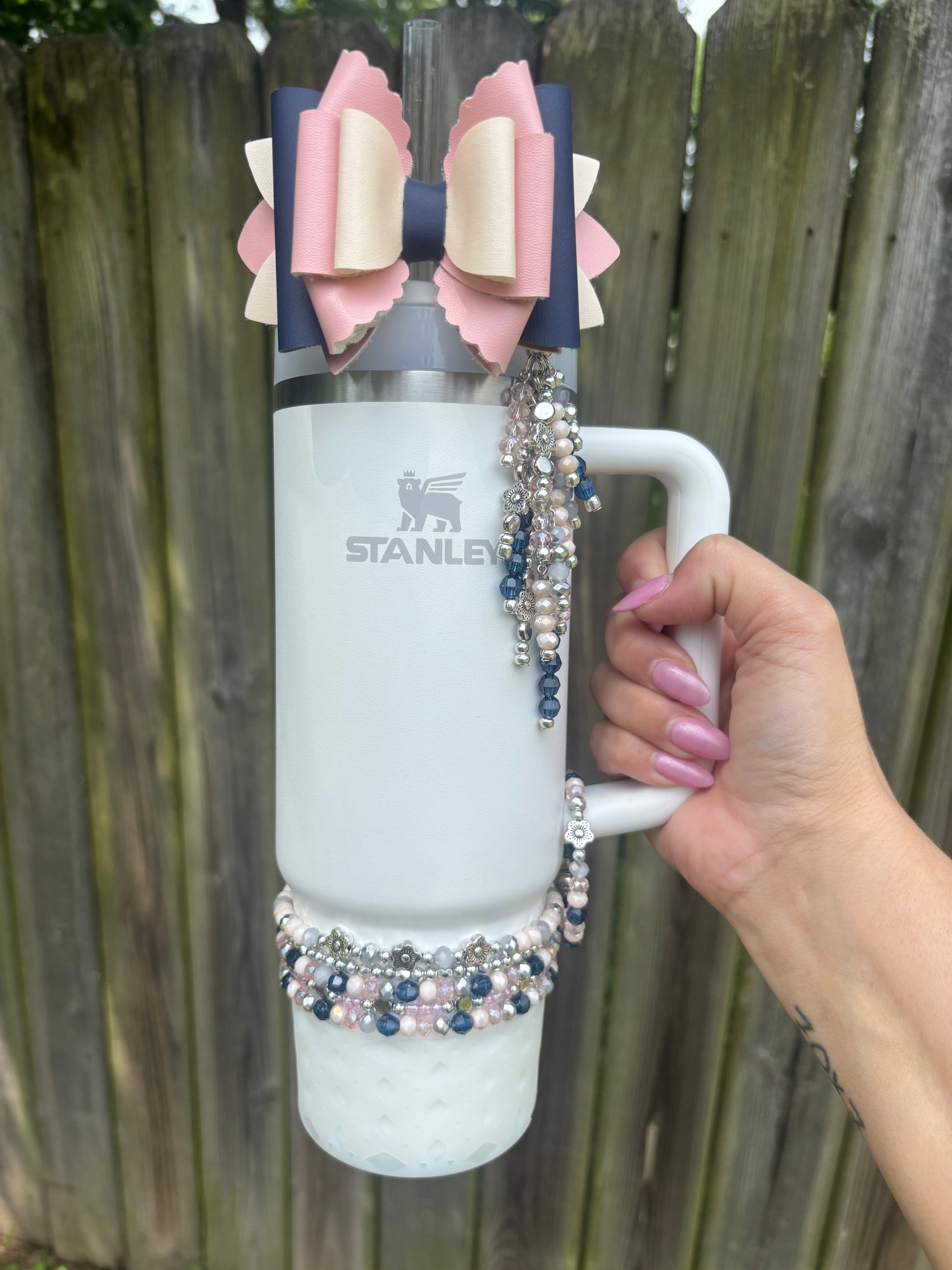 Bottom bracelets comes with a stack of 4 bracelets or 5. Fits 24oz Owala, 30 & 40oz Stanely’s & 32 oz Hydrojug. Message me OR leave a note at checkout for other for any other sizing needs such as “42oz HJ”.