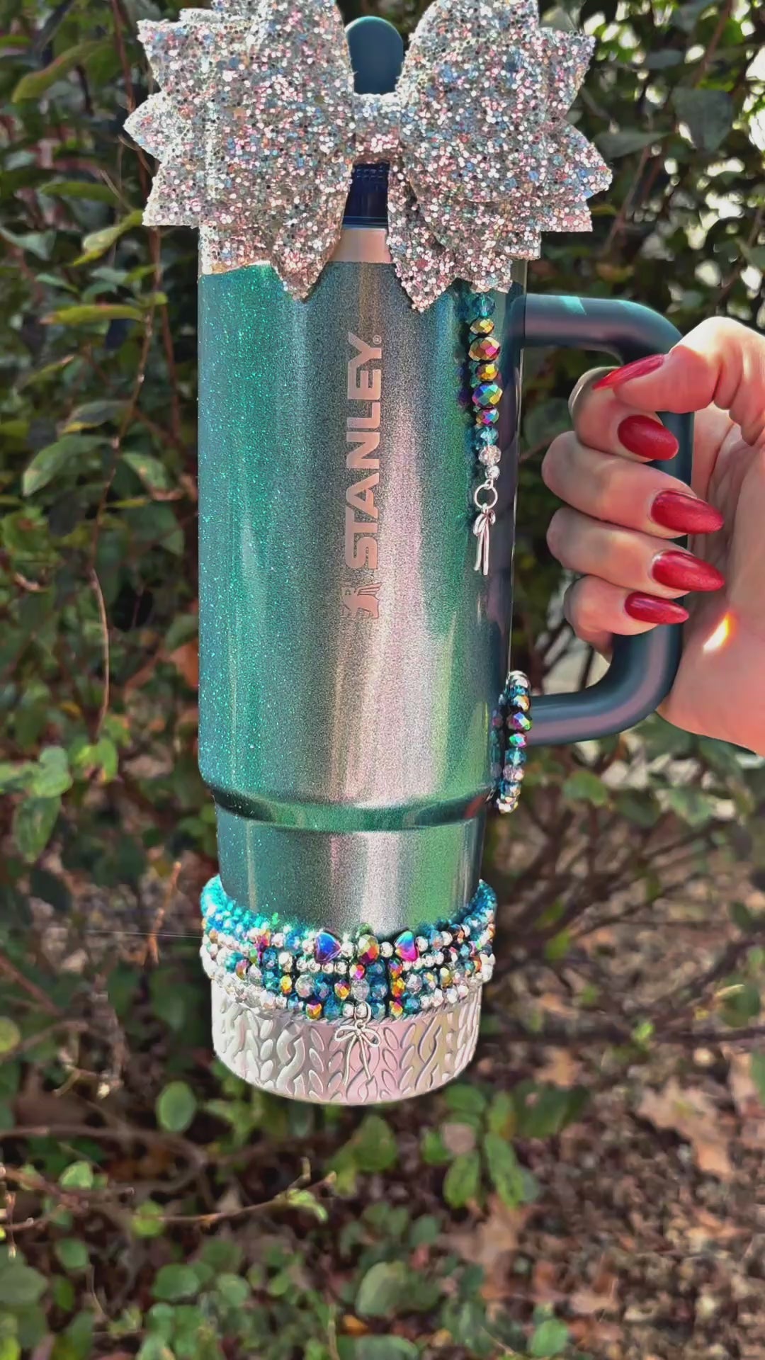 *Straw Dangle has acrylic attachment that slides down over straw which stays down and in place with a straw topper bow over the top. Fits 10mm straw. Spout option has loop to loop around spout.