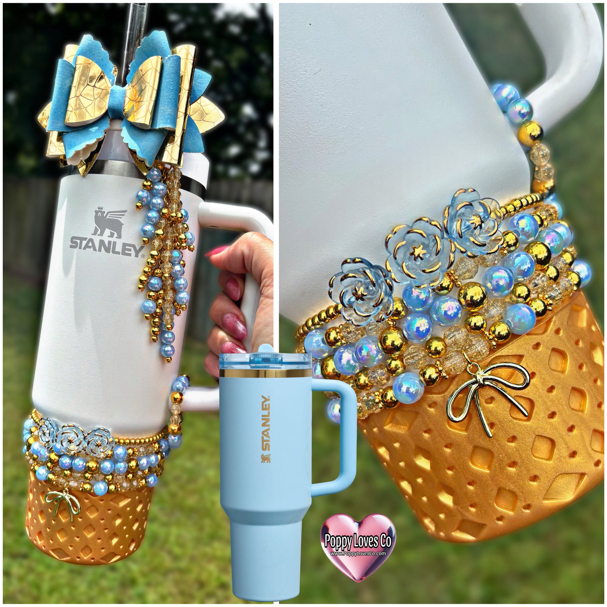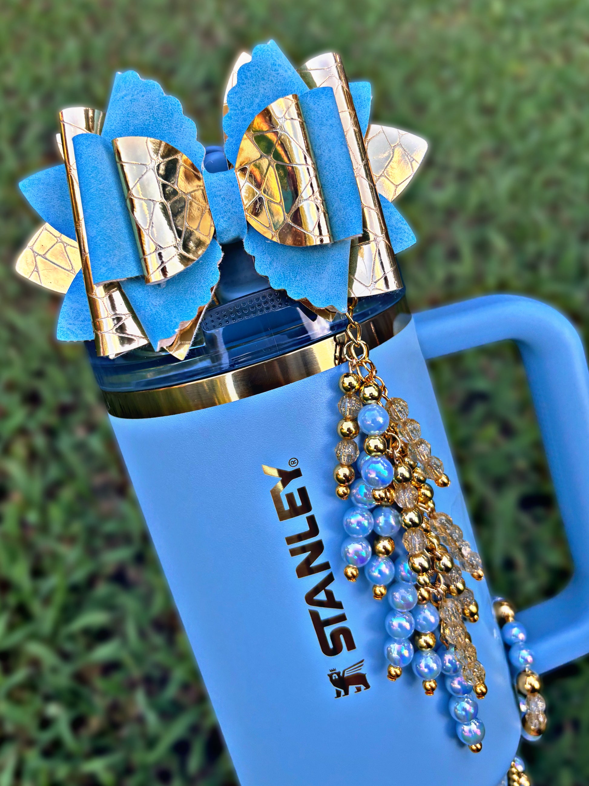 *Straw Dangle has acrylic attachment that slides down over straw which stays down and in place with a straw topper bow over the top. Fits 10mm straw. Spout option has loop to loop around spout.