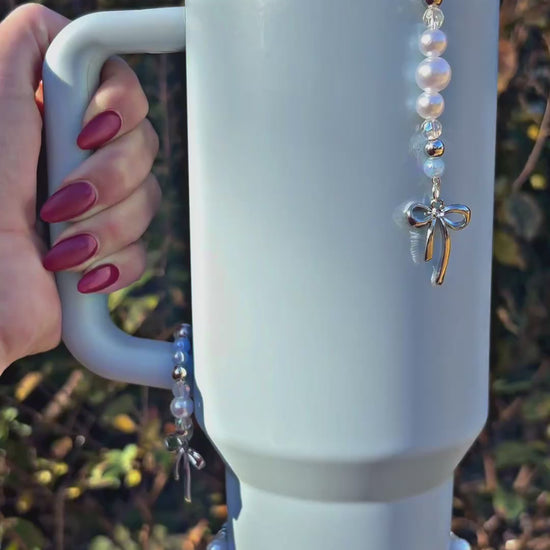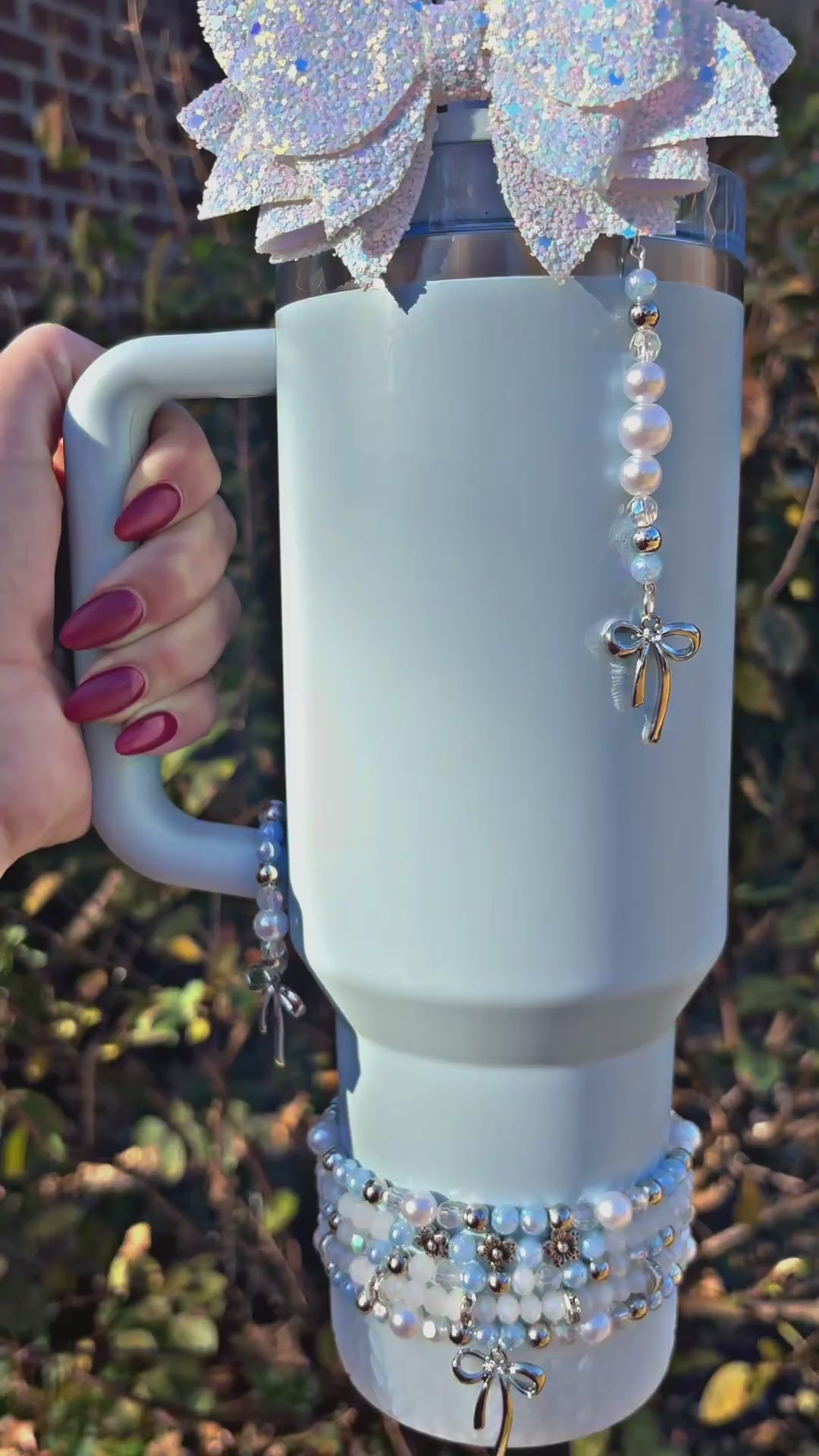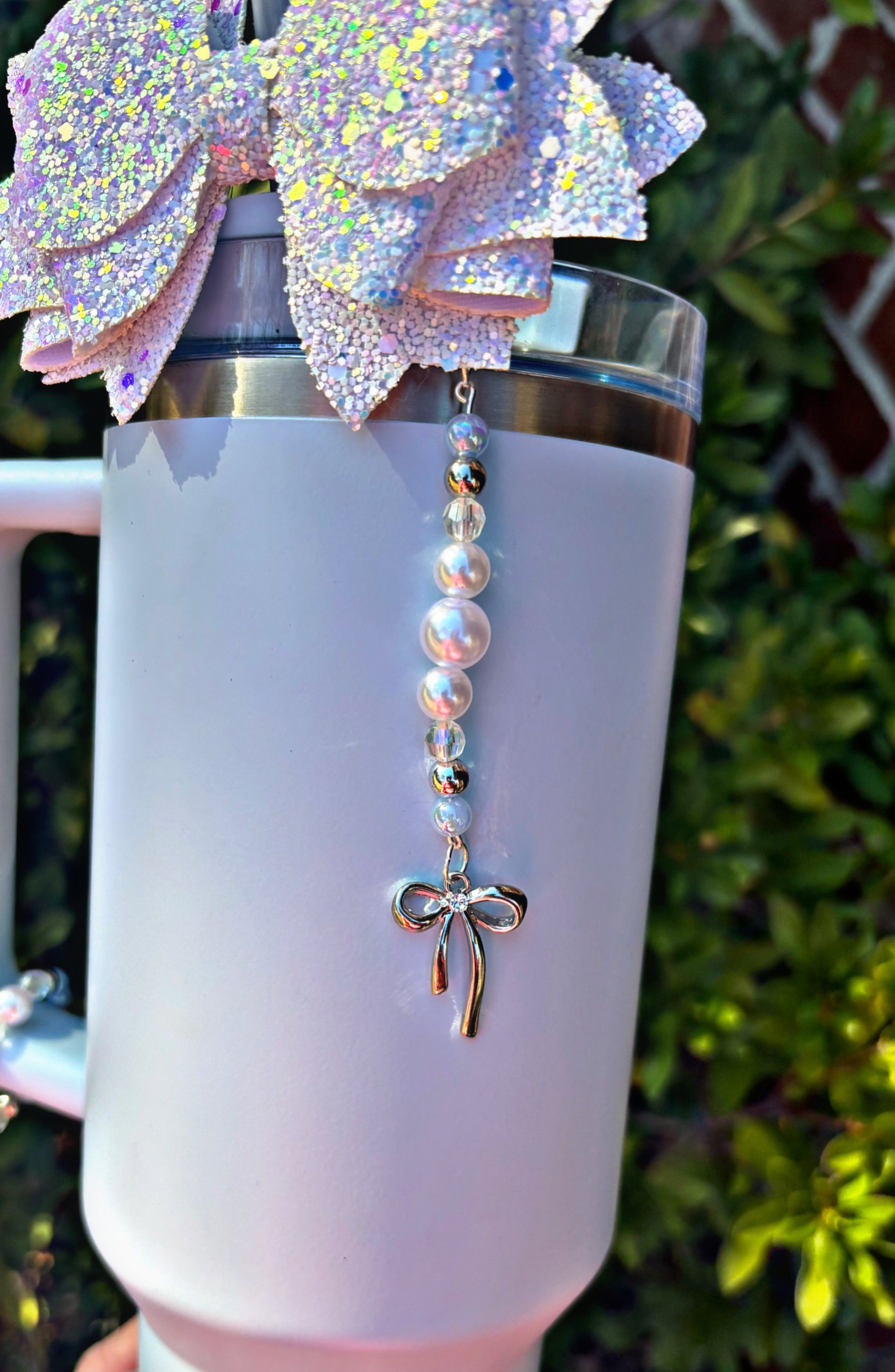 *Straw Dangle has acrylic attachment that slides down over straw which stays down and in place with a straw topper bow over the top. Fits 10mm straw. Spout option has loop to loop around spout.