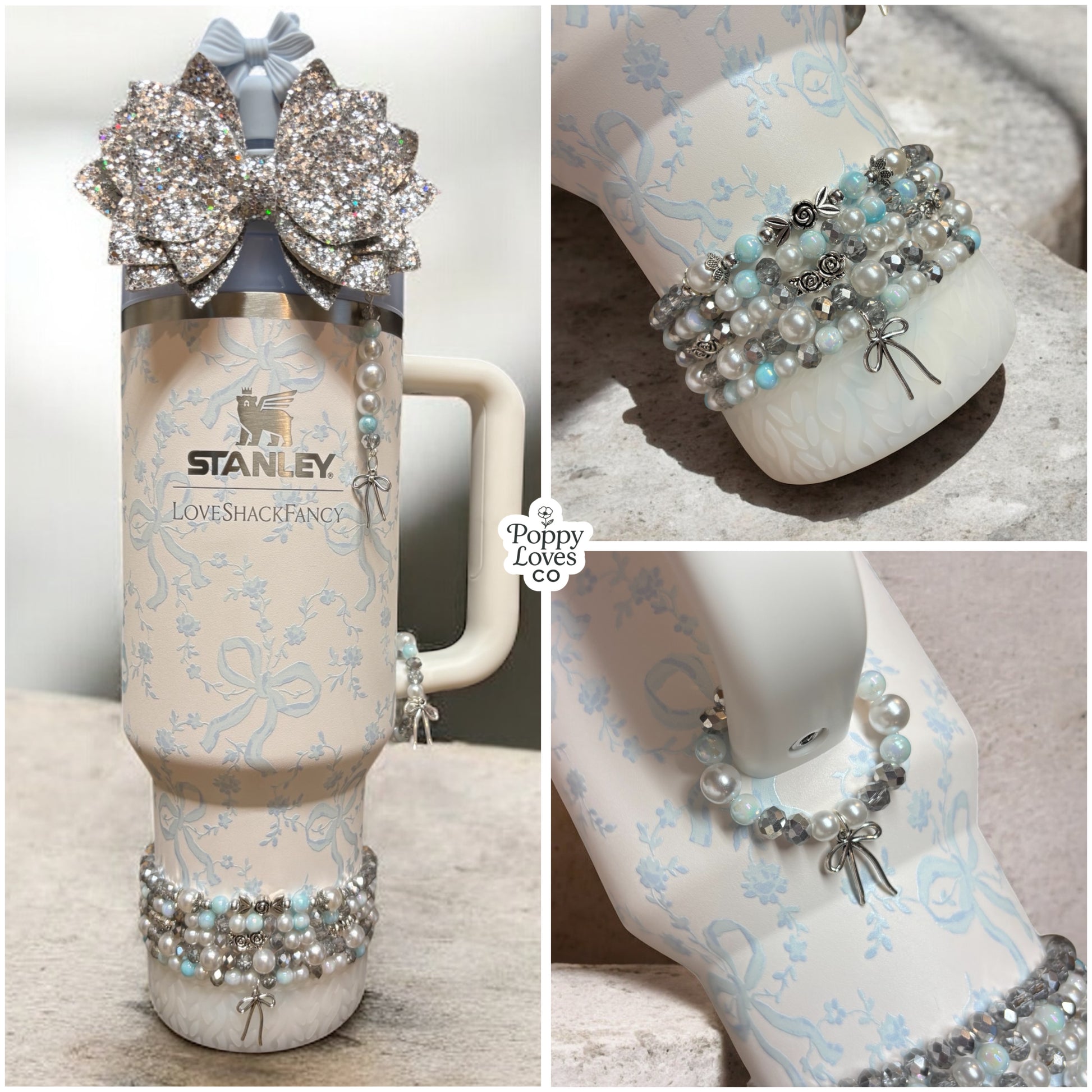 *Straw Dangle has acrylic attachment that slides down over straw which stays down and in place with a straw topper bow over the top. Fits 10mm straw. Spout option has loop to loop around spout.