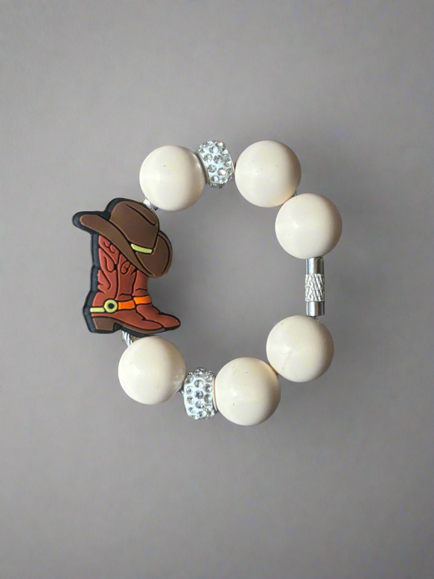 Can also go around some bag and purse handles. Made with silicone beads and flexible wire with twist closure for easy attaching and removing.