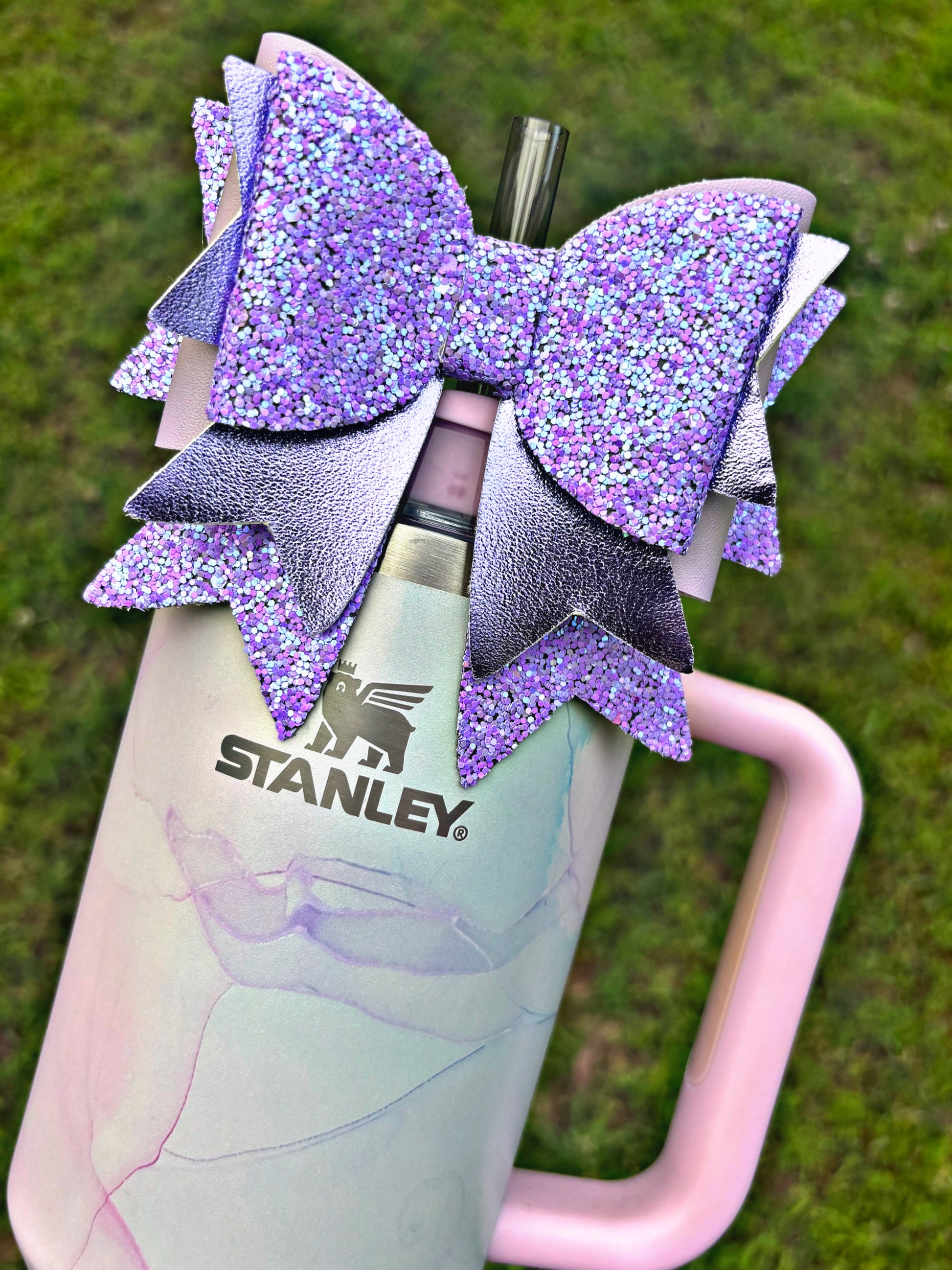 Soft Lavender Faux Leather & Smooth Gold Glitter. Bows are handmade and designed with elastic attachment to fit straw sizes 10mm. They will also fit Protour & Hydrojug Spouts.